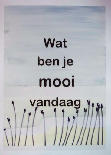 Tekst op transparant kunststof, handbeschilderd met speciaal bewerkte verf waardoor het werk doorzichtig blijft.